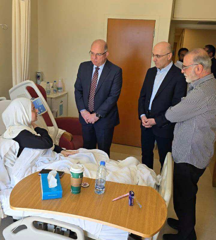 وزيرا الداخلية والبلديات أحمد الحجار والعمل محمد حيدر، الجريحة أماني بزي شرارة في مستشفى الجامعة الأميركية في بيروت، حيث تخضع للعلاج بعد إصابتها في الغارة الإسرائيلية التي استهدفت بنت جبيل.