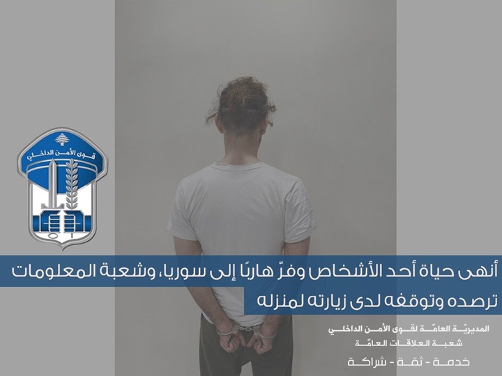 أظهرت التحريات التي اجرتها شعبة المعلومات أن القاتل فرّ إلى الأراضي السورية بعد ارتكاب الجريمة، لكن متابعة مستمرة كشفت عن تردده إلى منزله في بلدة العزونية مرات عدة خلال العام الحالي بتاريخ 20-10-2025، وبعد عملية رصد ومراقبة دقيقة، نفّذت إحدى دوريات الشعبة عملية مداهمة لمنزل القاتل في محلة العزونية، وتم توقيفه في داخله أُجري المقتضى القانوني بحقه، وتم تسليمه إلى القطعة المعنية، بناءً على إشارة القضاء المختص".