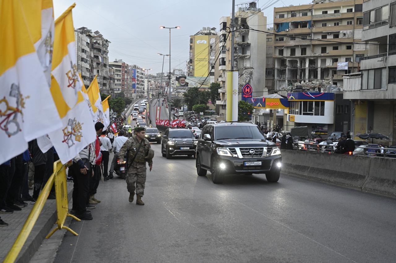 وعبر موكب البابا أوتوستراد هادي نصرالله حيث اصطفّت عناصر "كشافة المهدي" على جانبي الطريق، حاملين الأعلام اللبنانية، ومرددين أناشيد ترحيبية بالحبر الأعظم.