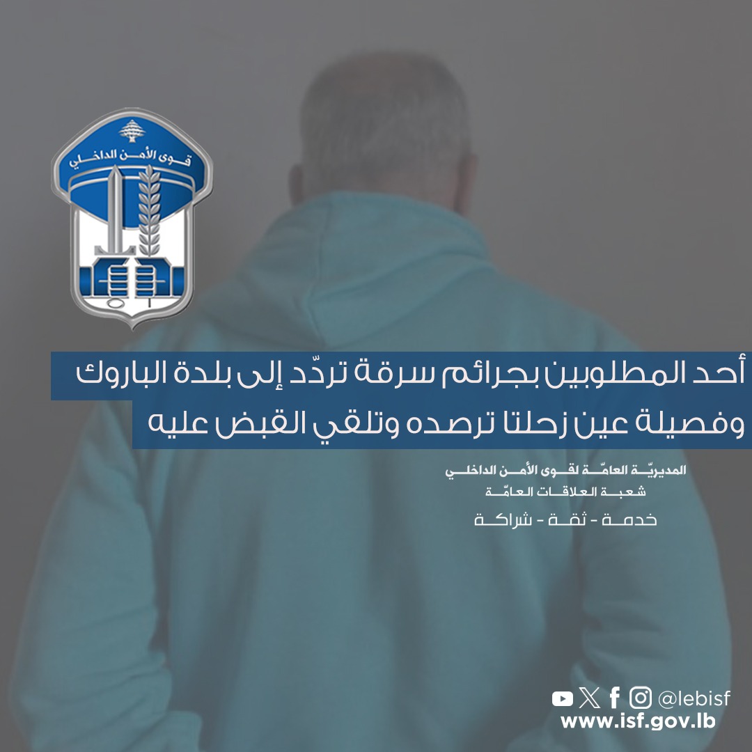 قوى الأمن الداخلي لملاحقة المطلوبين للقضاء وتوقيفهم، وبناءً على معلومات توافرت لدى فصيلة عين زحلتا ضمن سرية بيت الدين في وحدة الدرك الإقليمي حول وجود أحد المطلوبين في محلة الباروك وتردّده إلى محل إقامة اتّخذه فيها، وبنتيجة المتابعة، تمّ تحديد مكان وجوده وكشف هويّته، ويدعى – ر. ح. (مواليد عام 1974، لبناني) بتاريخ 8-1-2026، قامت قوّة من الفصيلة بمداهمة المكان المذكور وتوقيفه، حيث تبيّن أنّه مطلوب للقضاء بموجب /4/ ملاحقات عدلية بجرائم سرقة".