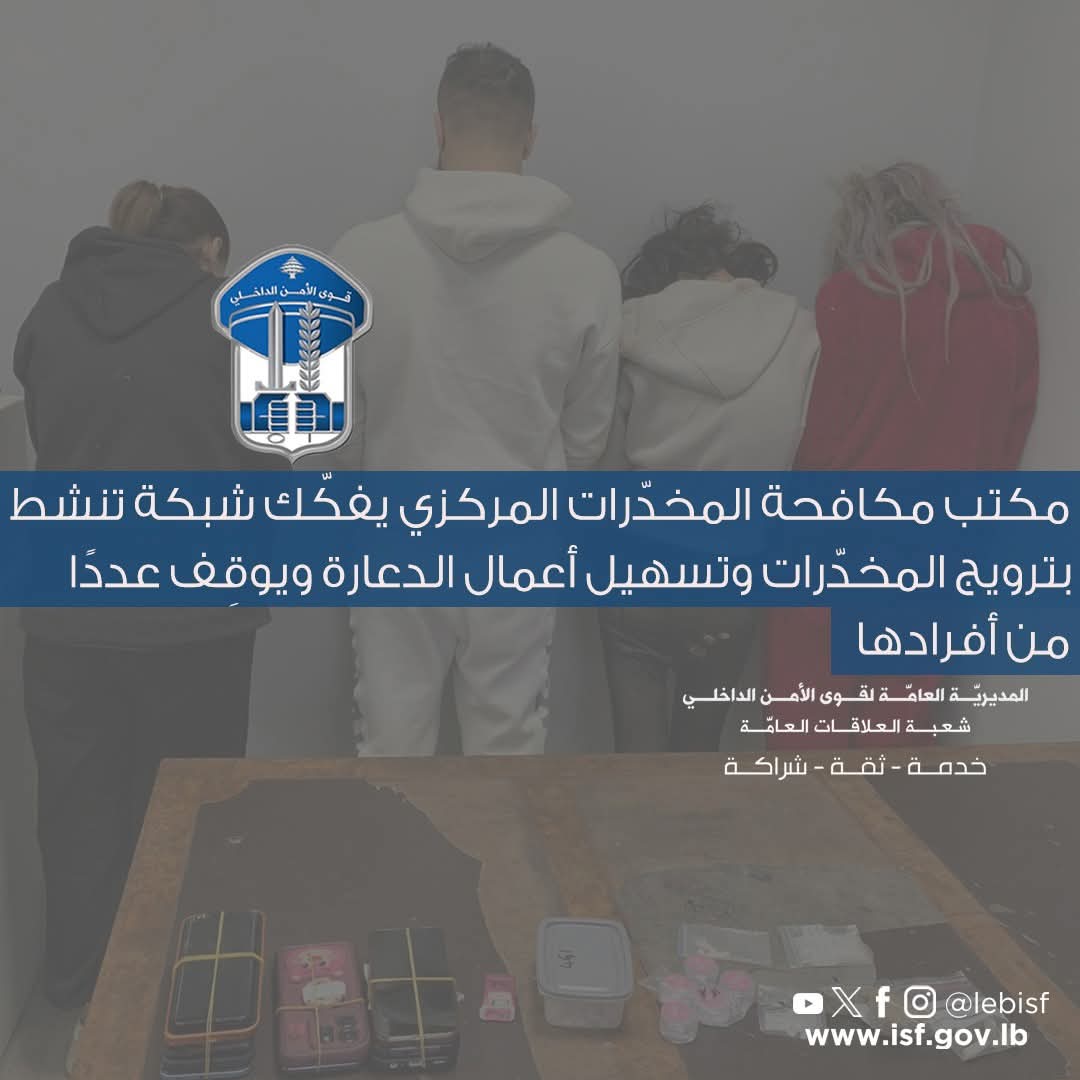 "في إطار المُتابعة المستمرّة التي تقوم بها قوى الأمن الداخلي لملاحقة المتورّطين بجرائم المخدّرات وتوقيفهم، توافرت معلومات لدى مكتب مكافحة المخدّرات المركزي في وحدة الشرطة القضائية حول شبكة تنشط في ترويج المخدّرات وتسهيل أعمال الدعارة في منطقة الدكوانة.