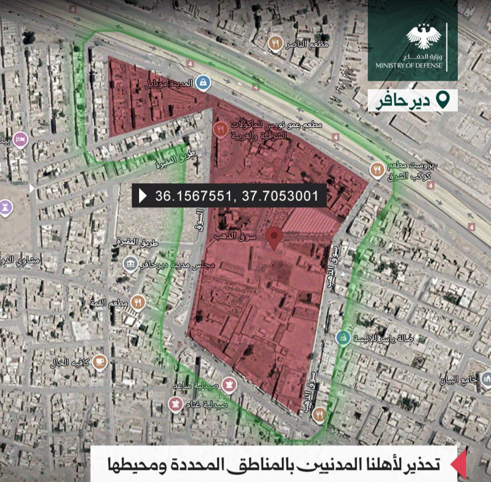 نشرت هيئة العمليات في الجيش السوري خريطة الموقع رقم 4 في منطقة دير حافر، وأصدرت عبر وكالة سانا بيانًا تحذيريًا للأهالي.