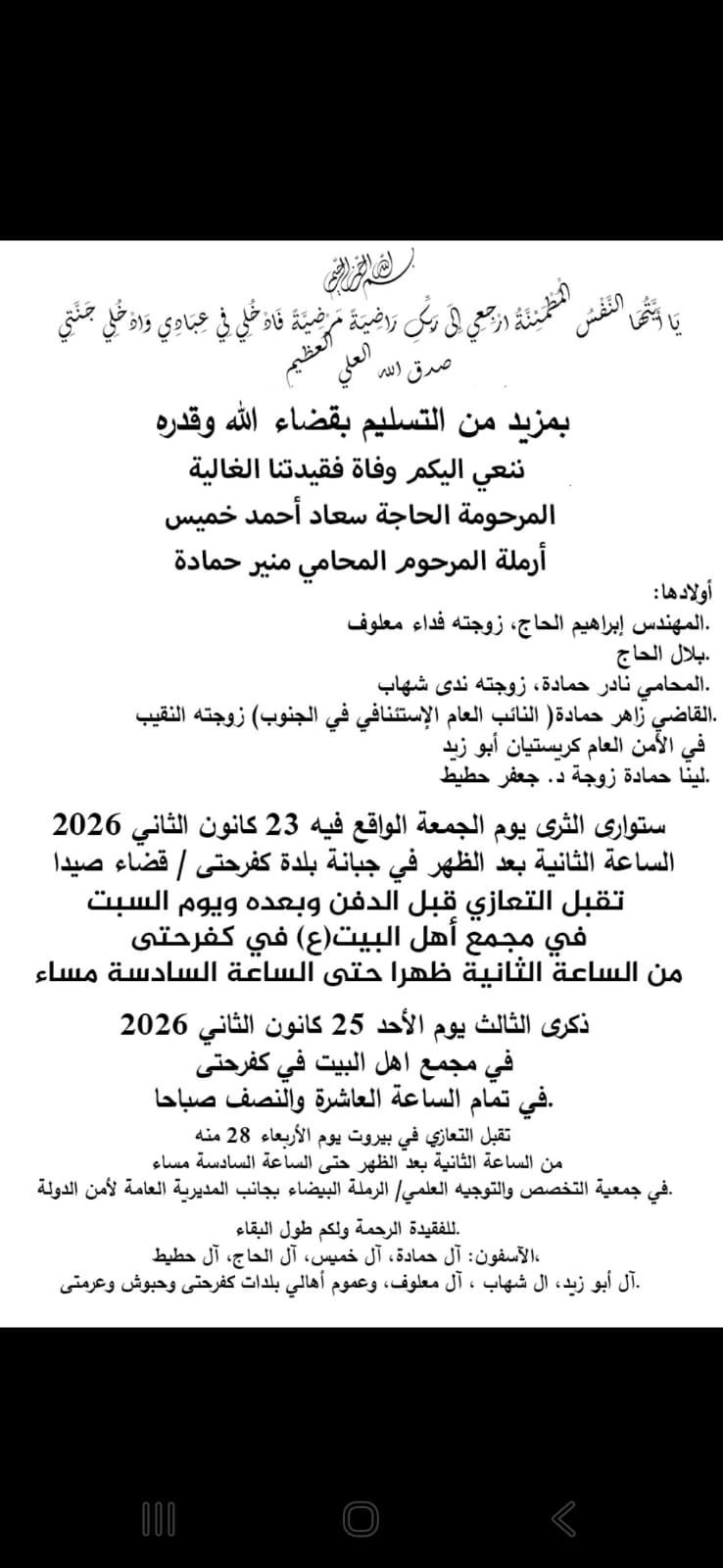 انتقلت الى رحمة الله تعالى المرحومة الحاجة سعاد احمد خميس والدة النائب العام الاستئنافي في الجنوب القاضي زاهر حمادة وستوارى الثرى اليوم الجمعة في تمان الساعة ٢ ظهرا في بلدة كفرحتى
