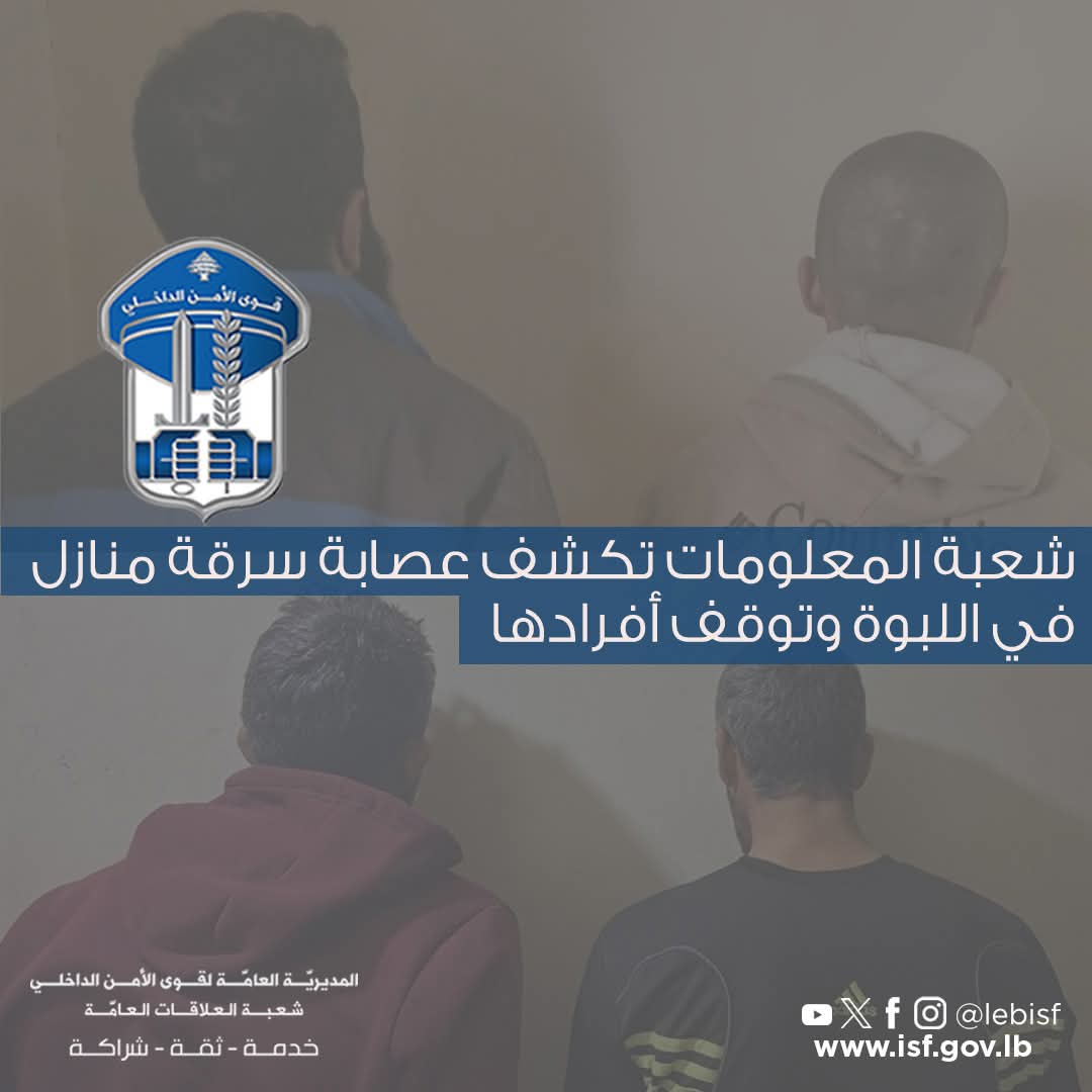 "في إطار المُتابعة اليومية التي تقوم بها قوى الأمن الدّاخلي لمكافحة عمليات السرقة في مختلف المناطق اللبنانية، توافرت مُعطيات لشعبة المعلومات حول قيام مجهولين بتنفيذ عمليات سرقة من داخل المنازل، في بلدة اللبوة.