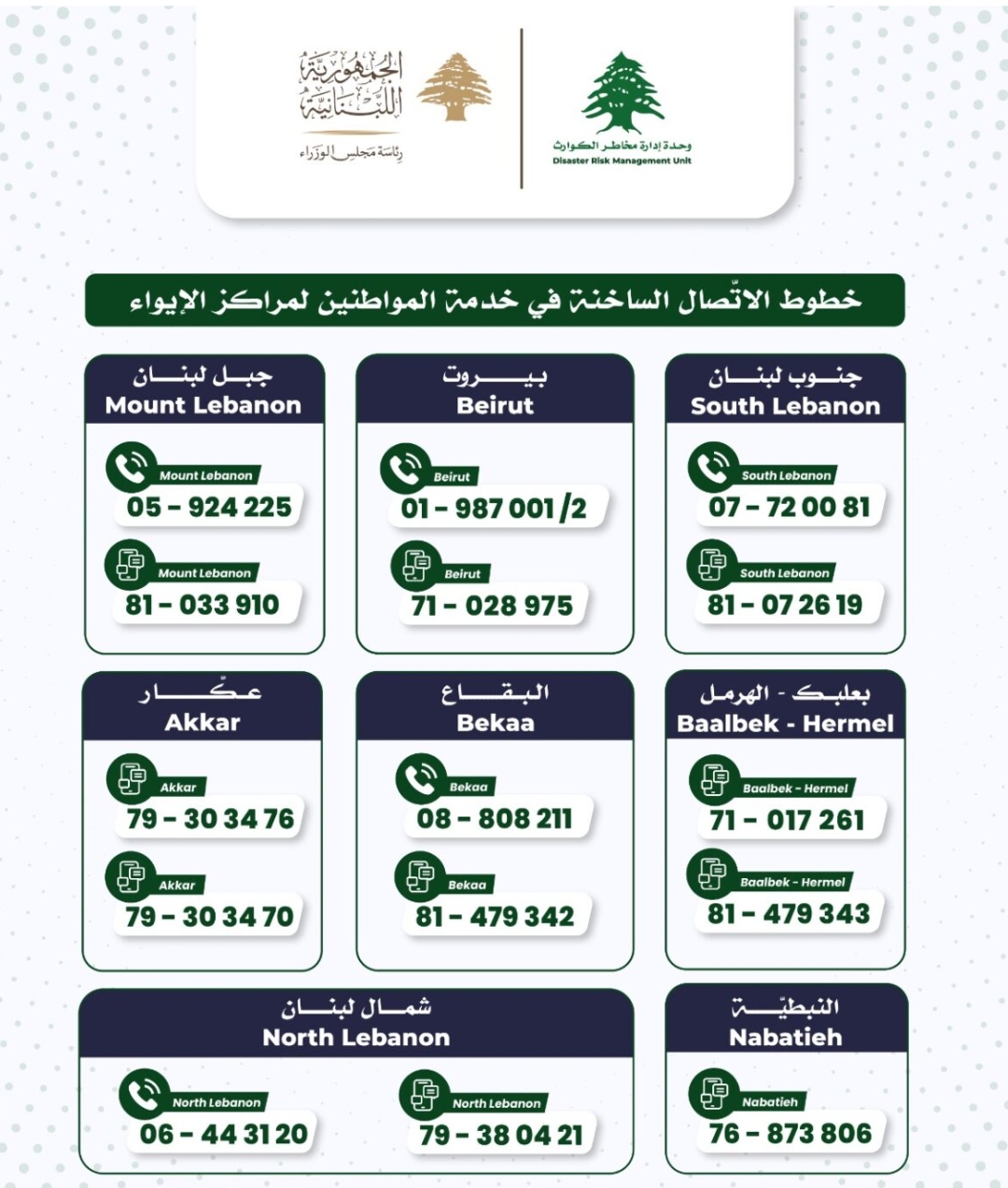 تذكّركم وحدة إدارة مخاطر الكوارث، بخطوط الاتصال الساخنة في مُختلف المناطق والمحافظات للاستعلام عن مراكز الإيواء.