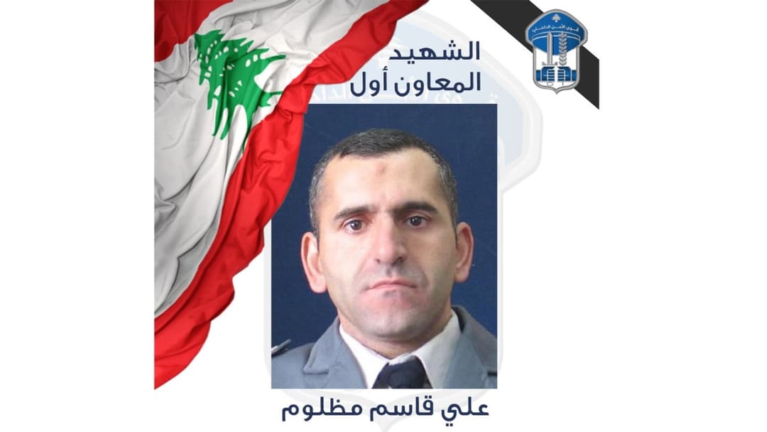 "تنعي المديريّة العامّة لقوى الأمن الداخلي شهيدها المعاون أوّل علي قاسم مظلوم الذي استشهد بتاريخ 5-3-2026، في أثناء توجّهه إلى مركز خدمته، على متن سيّارة استهدفها العدوّ الإسرائيلي في مدينة زحلة.