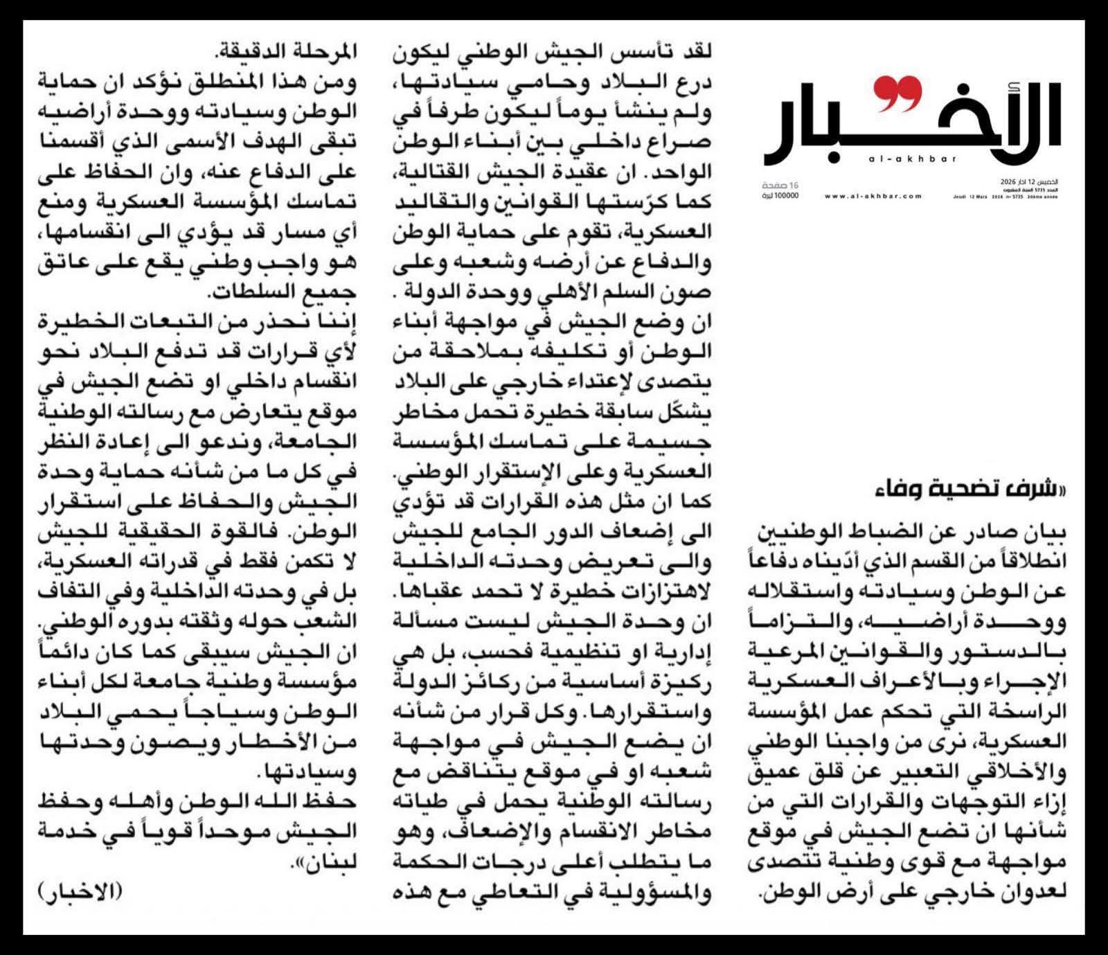 انطلاقًا من هذه المسؤولية، فإن نشر مقال "الأخبار" بكامل مضمونه كما ورد، يأتي حفاظًا على الأمانة المهنية والاعتبار القانوني، وفي الوقت نفسه يشكّل إخبارًا موجّهًا إلى النيابة العامة التمييزية للنظر في ما ورد فيه، واتخاذ التدابير اللازمة إذا تبيّن أن ما نُشر يتضمن معلومات مفبركة أو طرحًا قد يؤدي إلى إثارة الفتنة أو المسّ بالمؤسسة العسكرية.