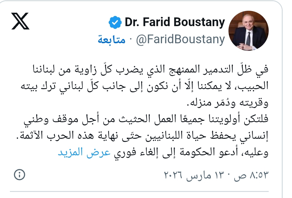 “في ظلّ التدمير الممنهج الذي يضرب كلّ زاوية من لبناننا الحبيب، لا يمكننا إلّا أن نكون إلى جانب كلّ لبناني ترك بيته وقريته ودُمّر منزله.