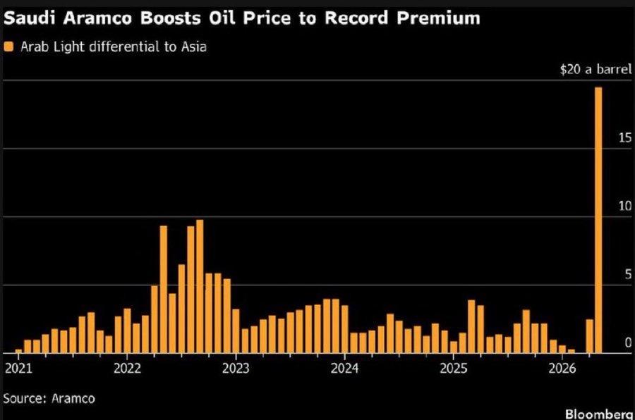 رفعت شركة أرامكو السعودية سعر بيع النفط لشهر أيار إلى الأسواق الآسيوية إلى مستوى قياسي بلغ +19.50 دولارًا للبرميل، مقارنة بـ +2.50 دولارًا سابقًا.