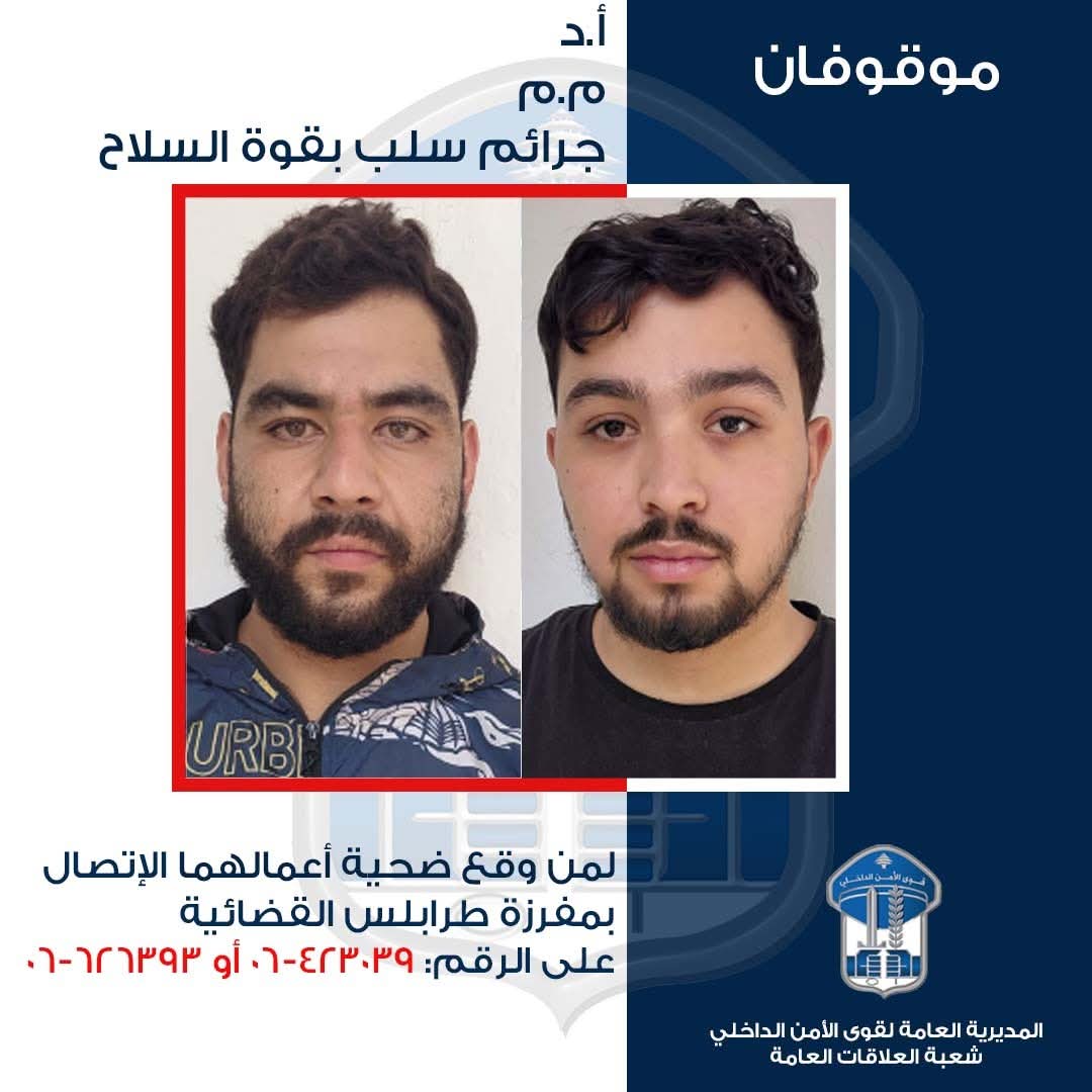 تُعمِّم المديريّة العامّة لقوى الأمن الدّاخلي، بناءً على إشارة القضاء المختص، صورة موقوفَين مُشتبه فيهما بالقيام بجرائم سلب بقوّة السّلاح، وهما:
