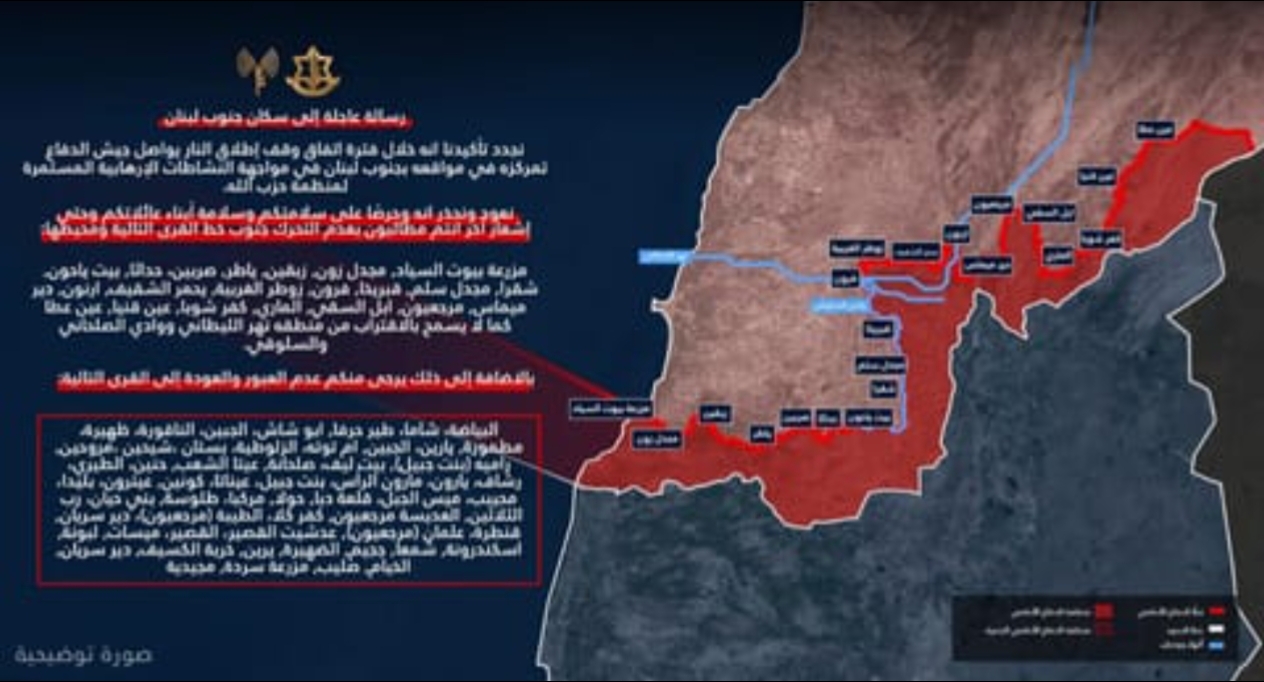 نعود ونحذر انه وحرصًا على سلامتكم وسلامة أبناء عائلاتكم وحتى إشعار آخر انتم مطالبون بعدم التحرك جنوب خط القرى المعروضة ومحيطها