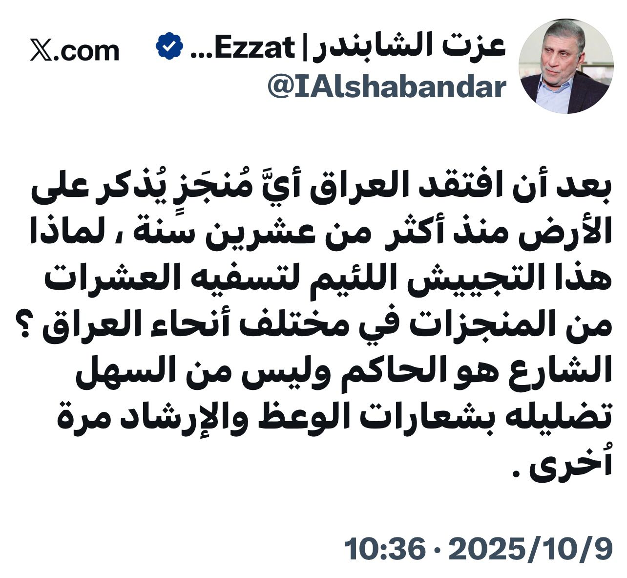 "‏بعد أن افتقد العراق أيَّ مُنجَزٍ يُذكر على الأرض منذ أكثر من عشرين سنة ، لماذا هذا التجييش اللئيم لتسفيه العشرات من المنجزات في مختلف أنحاء العراق ؟".