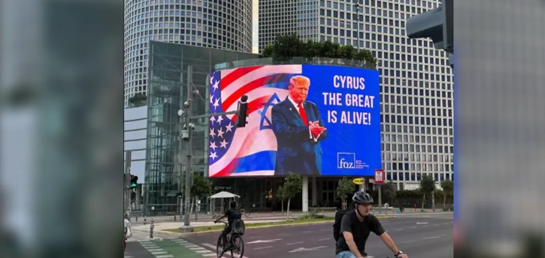 إحدى هذه اللوحات كتب عليها إلى جانب صورة ترامب والعلمين الإسرائيلي والأميركي: "كورش الكبير على قيد الحياة".