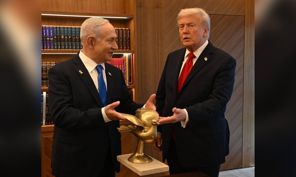 قدّم رئيس الحكومة الإسرائيلية بنيامين نتنياهو، حمامة ذهبية إلى الرئيس الاميركي دونالد ترامب كعربون تقدير لمساهمته الكبيرة في التوصل إلى اتفاق لإنهاء الحرب في غزة.