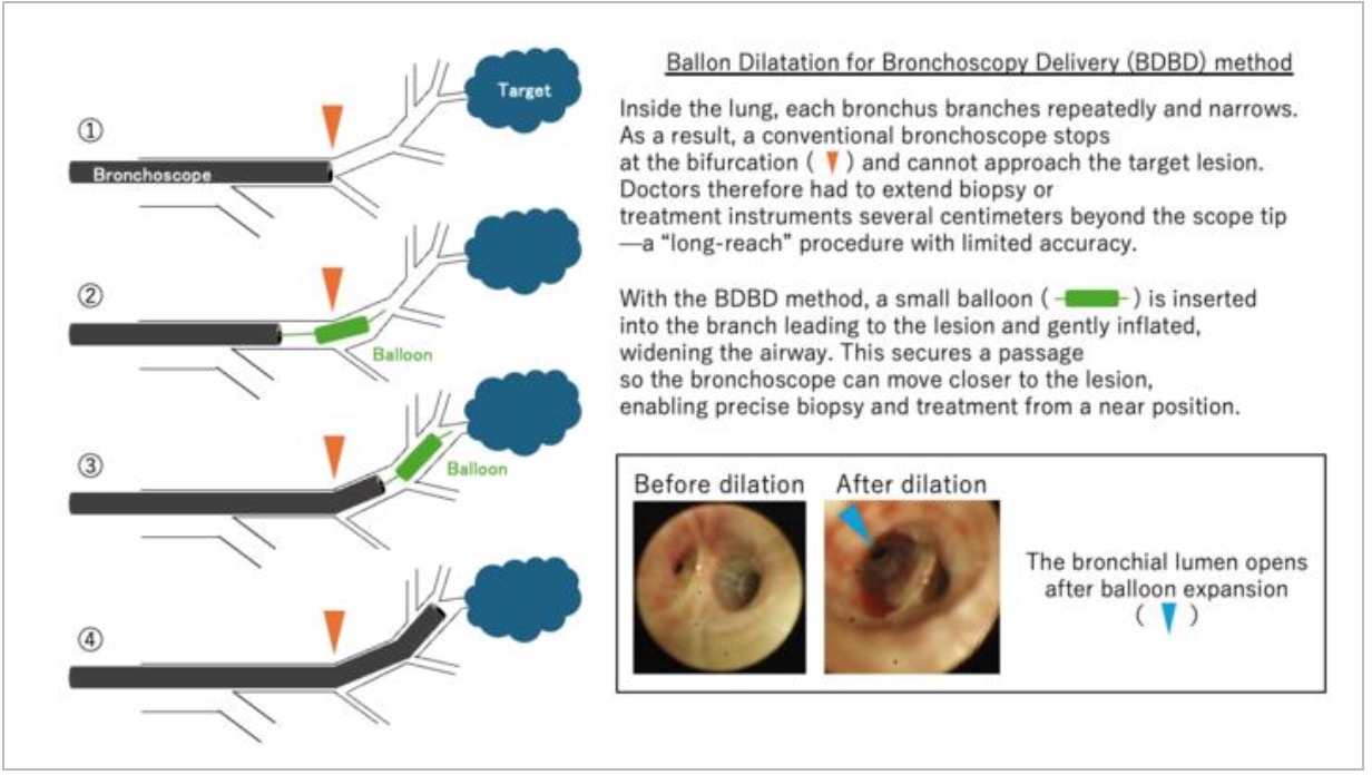 طوّر باحثون في جامعة أوساكا تقنية مبتكرة تُسمّى "التوصيل بالمنظار بمساعدة البالون"، تسمح بالوصول إلى الأورام الصغيرة العميقة داخل الرئة بشكل أكثر دقة وأماناً. وتعتمد الطريقة على إدخال قسطرة رفيعة مزوّدة ببالون يُنفخ مؤقتاً لتوسيع الشعب الهوائية، مما يمكّن المنظار من تجاوز مناطق التضيق والوصول مباشرة إلى العقد الطرفية حيث تختبئ الأورام.