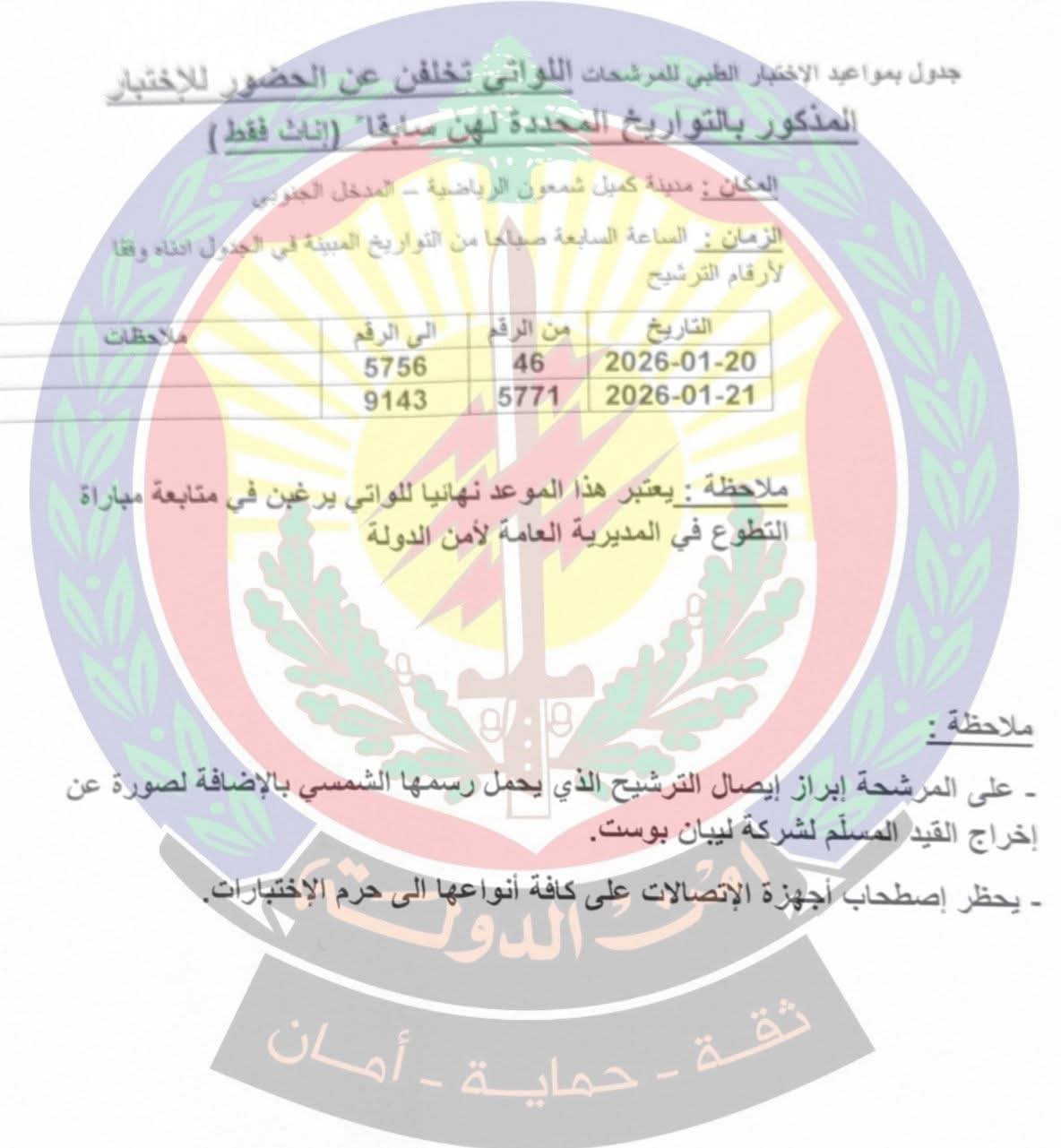 إلحاقًا لبيانها السابق المتعلّق بمواعيد الاختبار الطبي للمرشّحات المتطوّعات لرتبة مأمور متمرّن (إناث فقط)، تعلن المديرية العامة لأمن الدولة عن جدول جديد بمواعيد الاختبار الطبي للمُرشّحات اللواتي تخلّفن عن حضور الاختبار المذكور بالتواريخ المحددة لهن سابقاً (إناث فقط)، في مدينة كميل شمعون الرياضية – المدخل الجنوبي، عند الساعة السابعة صباحًا، وذلك وفقًا لأرقام الترشيح والتواريخ المذكورة أدناه.