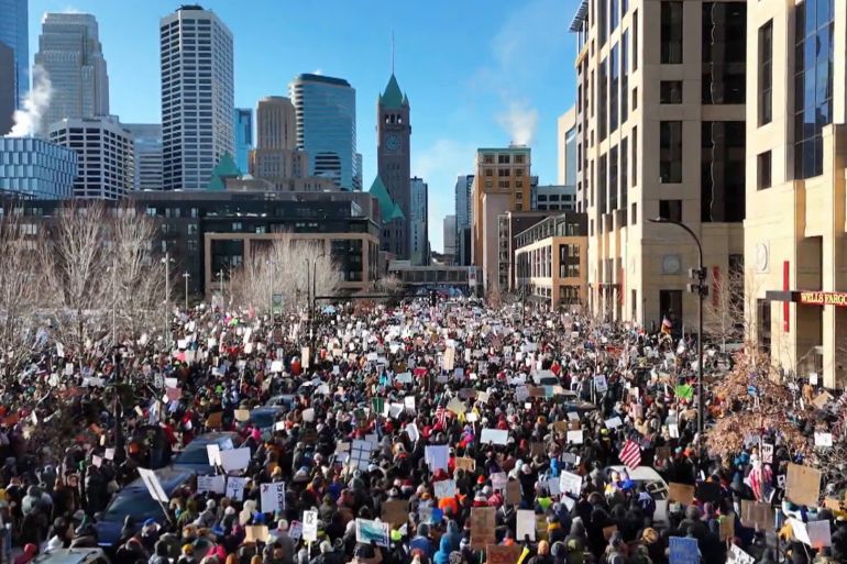 وقد خرج عشرات الآلاف إلى شوارع مدينة مينيابوليس رافعين شعار «أوقفوا إدارة الهجرة والجمارك»، تعبيرًا عن رفضهم للمداهمات العنيفة التي تنفذها الإدارة الفيدرالية بحق المهاجرين.