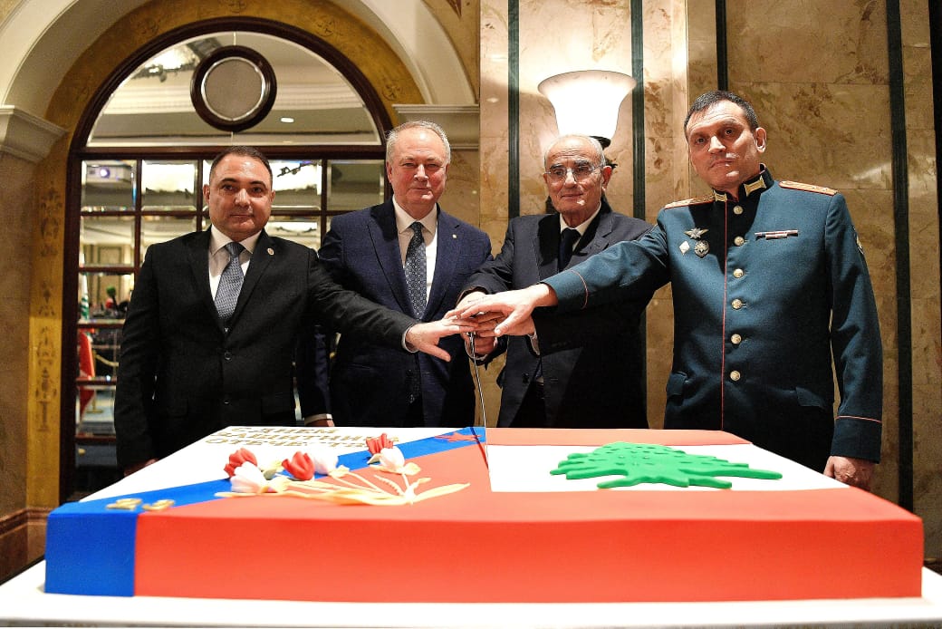 واختُتم الاحتفال بقطع قالب حلوى يحمل العلمين اللبناني والروسي، قبل أن يشارك الحضور في حفل كوكتيل أقيم للمناسبة، حيث رفع نخب «حماة الوطن»، في أجواء عكست عمق العلاقات الثنائية والحرص المُشترك على تعزيز التعاون بين لبنان وروسيا في مختلف المجالات".