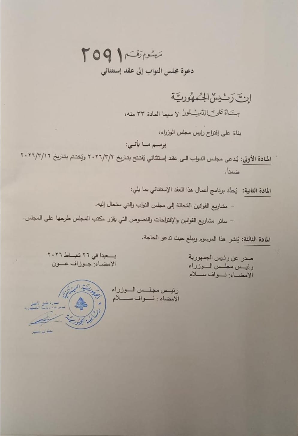 صدر ظهر اليوم المرسوم الرقم 2591 تاريخ 26 شباط 2026 القاضي بدعوة مجلس النواب الى عقد استثنائي يُفتتح في 2 آذار المقبل ويُختتم في 16 منه ضمناً.
