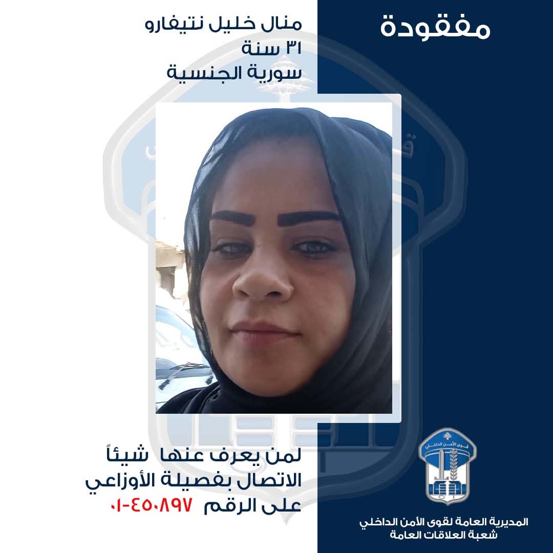 تُعمِّم المُديريّة العامّة لقوى الأمن الدّاخلي، بناءً على إشارة القضاء المختصّ، صورة المفقودة: