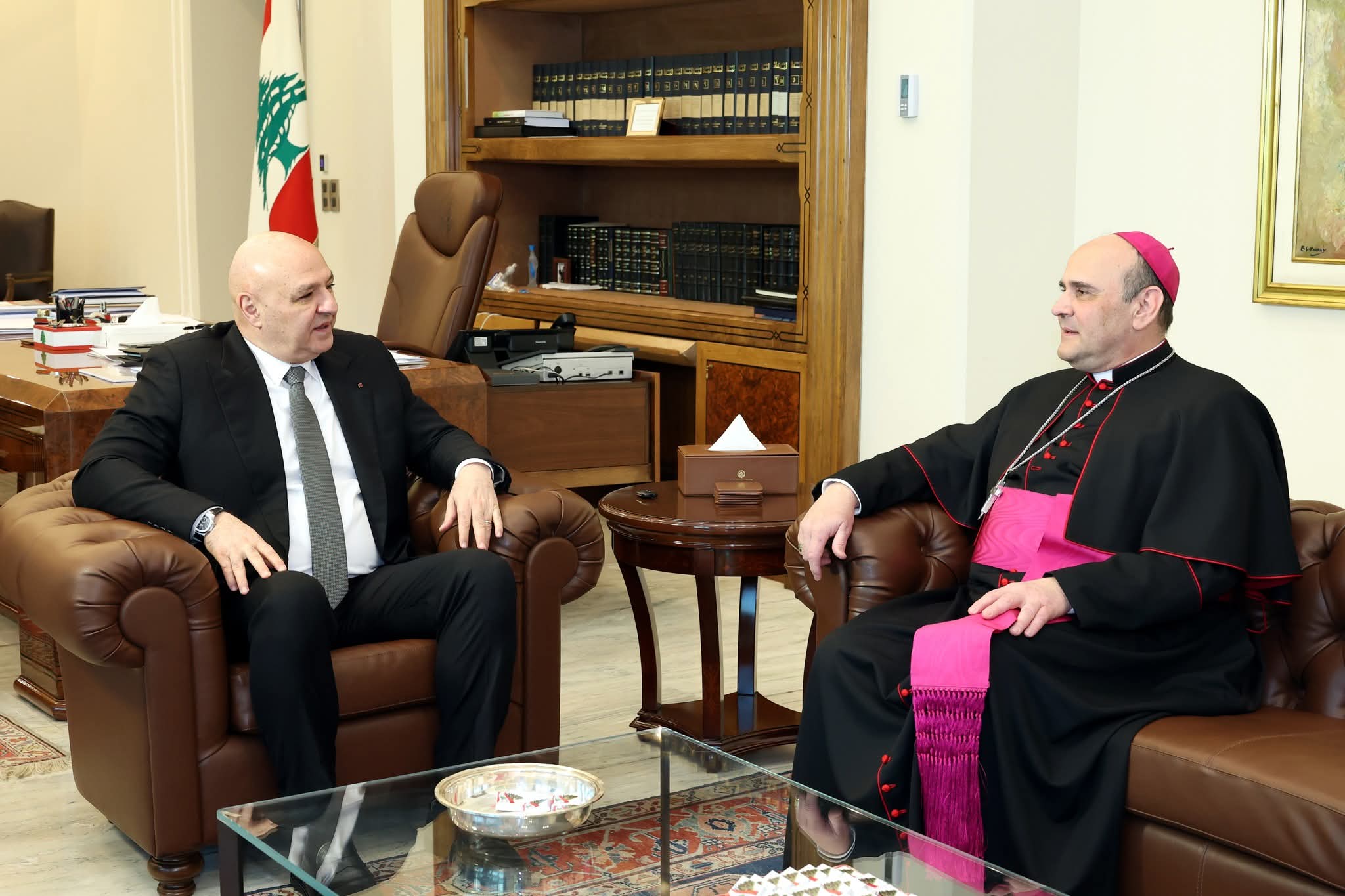 عرض رئيس الجمهورية العماد جوزاف عون الأوضاع والتطورات في لبنان مع السفير البابوي المونسنيور باولو بورجيا، الذي أطلعه على نتائج جولته في عدد من البلدات والقرى الجنوبية، ولا سيّما تلك التي صمد أهلها رغم تدهور الوضع الأمني.