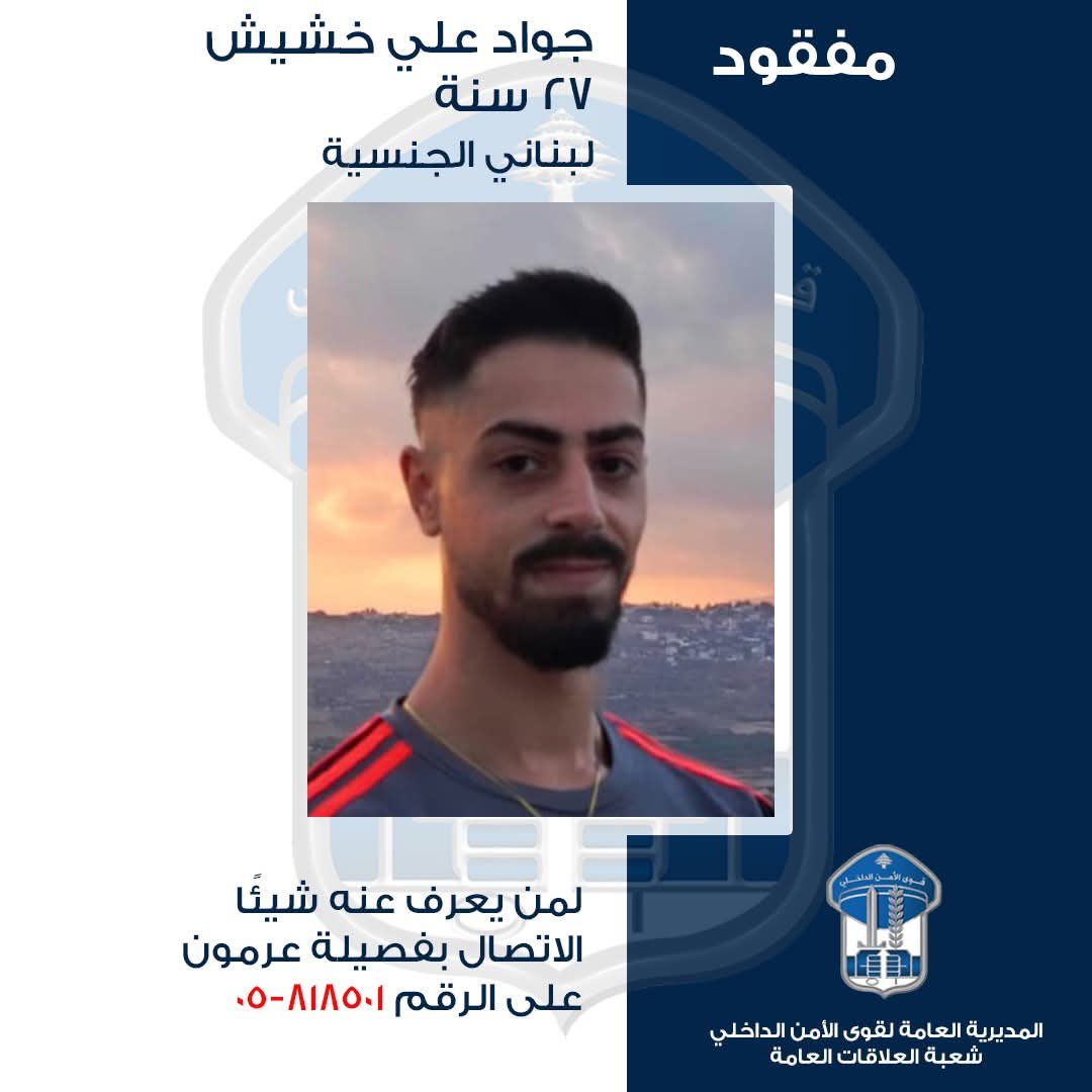 الذي غادر بتاريخ 7-3-2026، منزل ذويه الكائن في محلة خلدة، ولم يعد لغاية تاريخه.