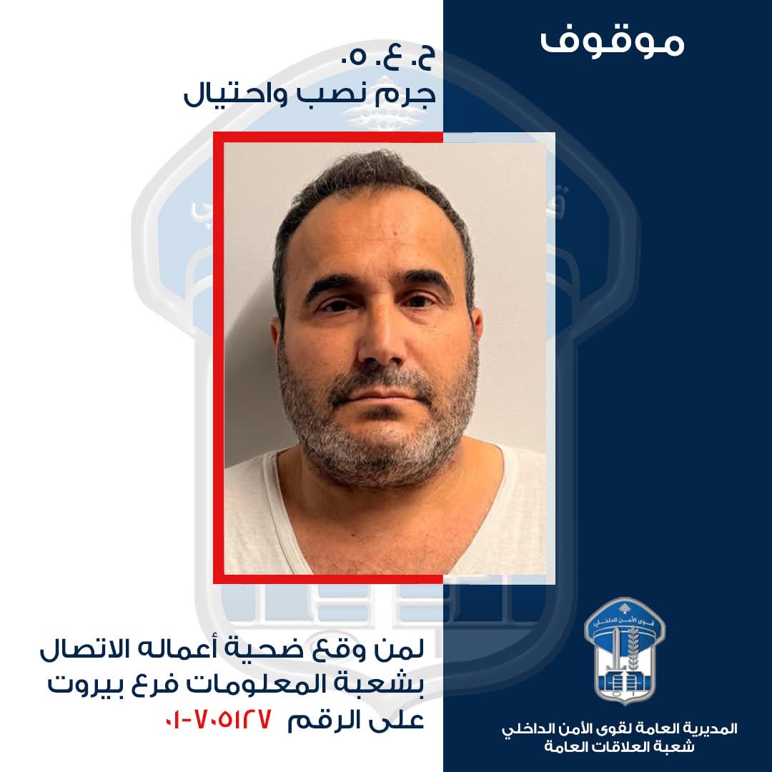 لذلك، تطلب هذه المُديريّة العامّة من الذين وقعوا ضحيّة أعماله، وتعرّفوا إليه، الاتّصال بشعبة المعلومات – فرع بيروت على الرقم: 705127-01، تمهيدًا لاتّخاذ الإجراءات القانونيّة اللّازمة.